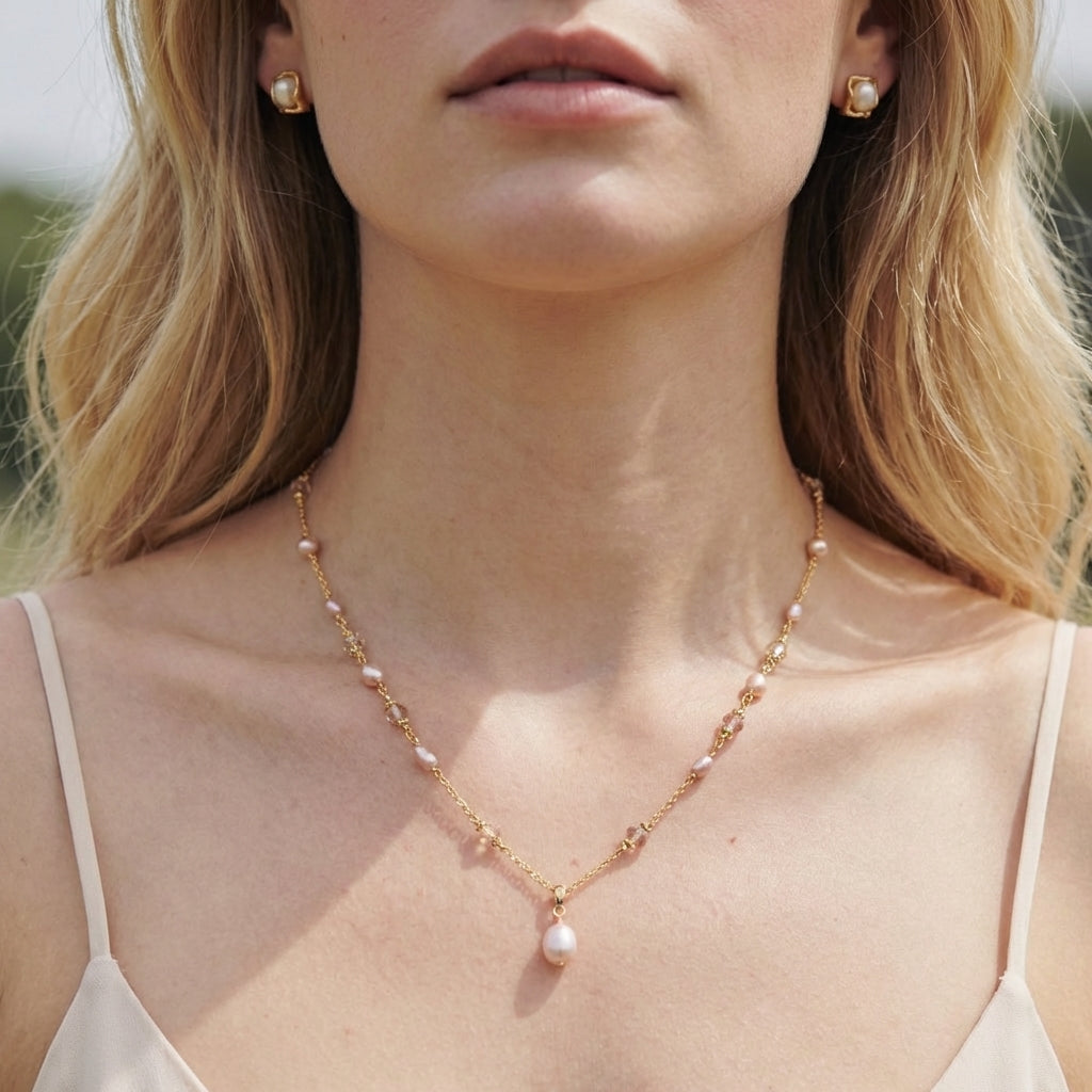 Eleganta un sievišķīga kaklarota, kas izgatavota no kvalitatīvas zeltītas bronzas un papildināta ar dabīgu saldūdens pērli. Katra pērle ir unikāla ar savu formu un maigo mirdzumu, piešķirot rotai dabisku šarmu un vieglu romantisku noskaņu.